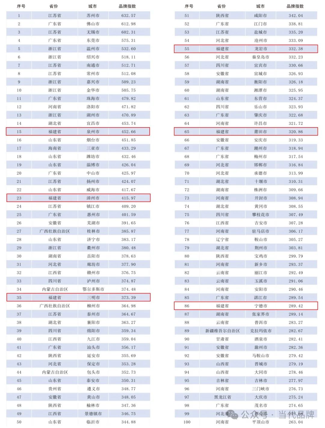在公布的前100名城市名单中,泉州市城市指数452.66,在省内最高,位列榜单第15名;漳州市城市指数415.97,占据榜单第23名;三明市城市指数373.39,占据榜单第35名;龙岩市、莆田市、宁德市则分别以332.38、320.86、289.42,位列榜单第55名、第65名和第86名。