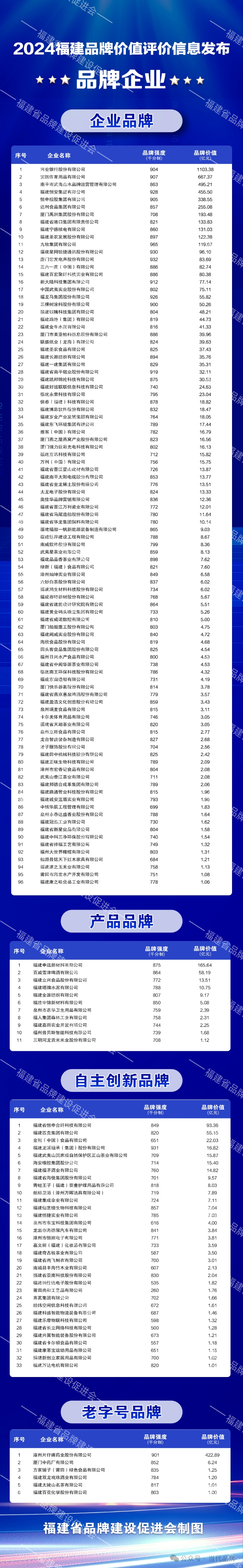 此次,共有146家企业和36个区域品牌上榜。品牌企业类包括企业品牌、产品品牌、自主创新品牌和老字号品牌。其中,企业品牌共有96家,兴业银行以品牌价值1103.38亿元、品牌强度904位居第一,安踏、武夷山水分别位居第二、第三;产品品牌共有11家,申远新材料、百威雪津啤酒、立兴食品位居前三,其中,申远新材料以品牌价值165.64亿元、品牌强度875位居产品品牌第一;自主创新品牌共有33家,恒申合纤、匹克、金冠食品位居前三,恒申合纤以品牌价值93.36亿元、品牌强度849排名第一;老字号品牌6家,片仔癀药业以品牌强度901、品牌价值422.89亿元位居第一。区域品牌类包括地理标志、产业集聚区和旅游目的地。地理标志品牌共有27个,安溪铁观音、武夷岩茶、建盏位居前三;产业集聚区品牌共有3个,分别为全国红木古典家具产业知名品牌创建示范区、浦城大米产业集聚区和武夷竹立方;上榜旅游目的地的共有6个,湄洲岛妈祖文化旅游区排名第一。