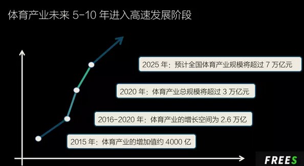 根据国家体育总局发布的统计数据显示:2015 年体育产业的增加值约 4000 亿,按照规划则年复合增速将达 28.7%。预计到 2016-2020 年,体育产业的增长空间为 2.6 万亿,年复合增速达到 49.62%。2020 年,体育产业总规模将超过 3 万亿元,占 GDP 比重将达 1.0%。在 2025 年,全国 31 个省(区、市)体育产业规模的目标值合计将超过 7 万亿元,按照这个数字计算则年复合增速将达到 33.14%。