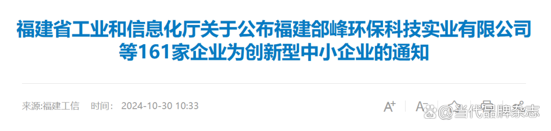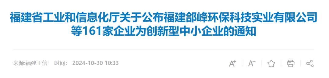 按照《福建省优质中小企业梯度培育管理实施细则》(闽工信规〔2024〕3号),现确定福建郃峰环保科技实业有限公司等161家企业为创新型中小企业,予以公布。