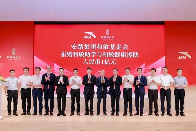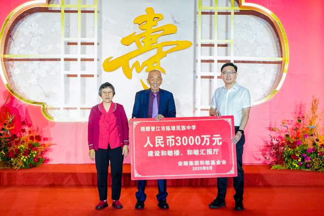 9月7日,安踏集团和敏基金会在晋江安踏982中心举行捐赠仪式,宣布向陈埭民族中学捐赠3000万元,助力家乡教育事业发展。安踏集团创始人、荣誉董事长、和敏基金会荣誉主席丁和木伉俪及家人出席仪式,晋江市人民政府市长王明元回赠鸣谢牌匾。此次捐赠将用于陈埭民族中学办公大楼及会议中心建设,建成后将满足学校扩容需求,为未来发展奠定坚实基础。