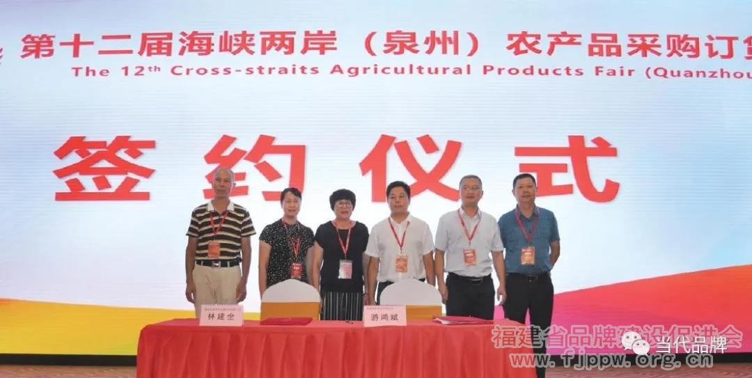 ▲2019年9月7日,在第十二届海峡两岸(泉州)农产品采购订货会上,浦城县人大常委会副主任杨先招(左三)、浦城县人民政府副县长何义仁(右三)、浦城县政府领导王静燕(左二)、福建省品牌建设促进会秘书长刘文镇(右二)等嘉宾共同见证“浦城大米”粮食产销对接签约仪式