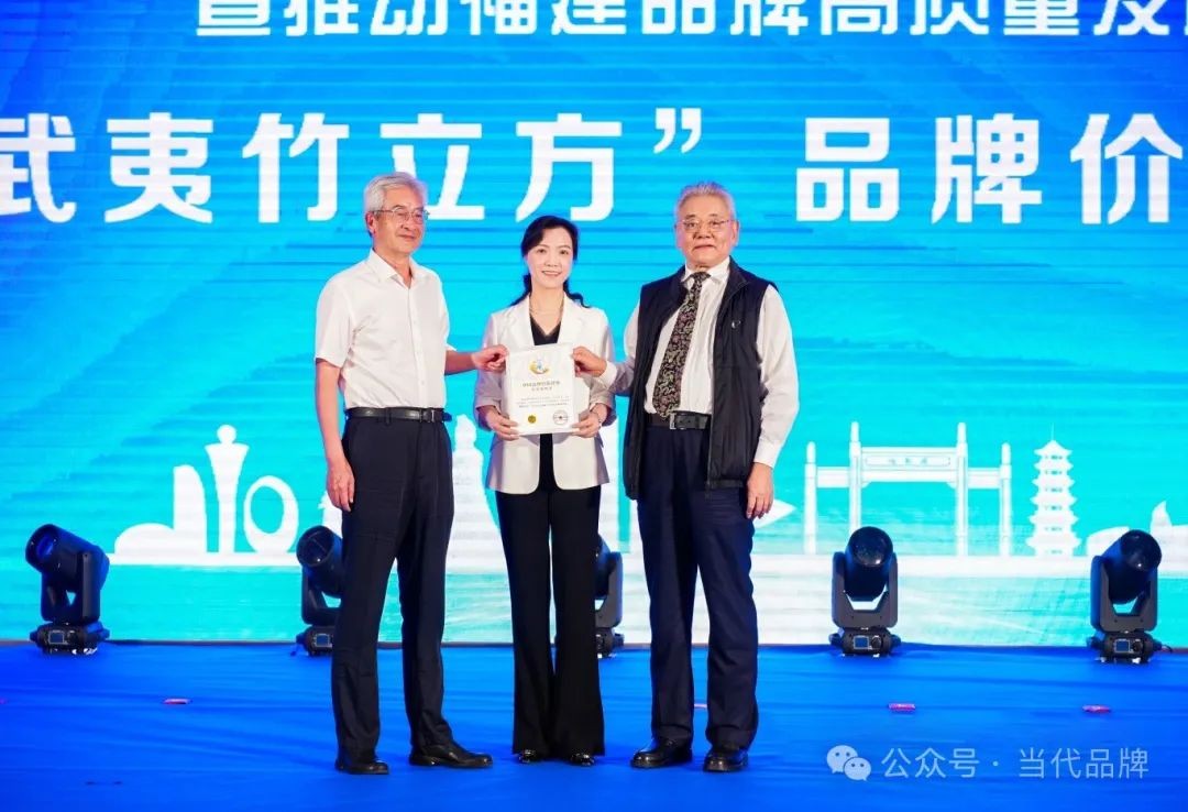 为邵武市委副书记、市人民政府市长郭绯红(中)颁发“武夷竹立方”品牌价值评价证书